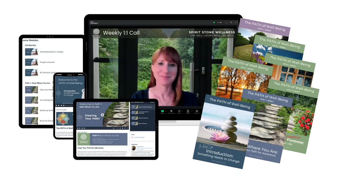 The PATH of Well-Being is a comprehensive 12-week Personal and Professional Transformation Journey led by Amber Heinrich, founder of Spirit Stone Wellness. Through a series of courses, wellness resources, and customized 1:1 sessions, you’ll learn how to make lasting changes to bring more harmony, meaning, and joy into your career and personal life.